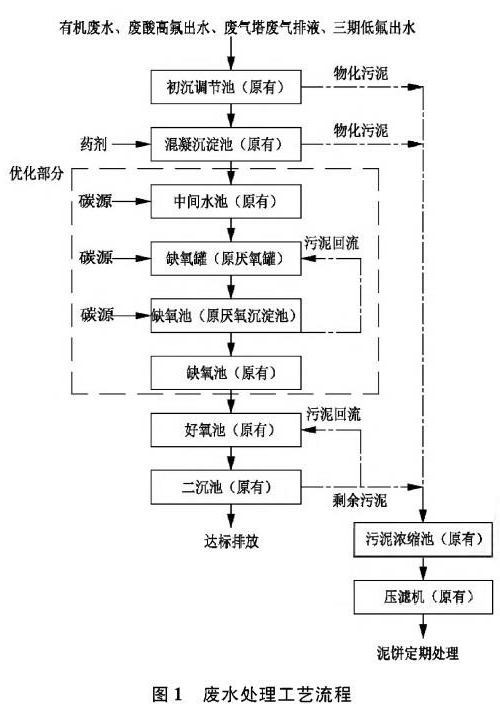 但随着企业生产工艺的更新和生产使用物料的变化,企业生产废水的主要污染物质也发生了变化,生产工艺上硝酸的大量使用,使得废水中的主要污染物由有机物转变为硝态氮,综合废水的硝态氮浓度高达644mg/L。原有厌氧罐主要用于处理有机物,其采用底部布水,无三相分离器,上升流速较低,污泥容易堆积,且后续缺氧池停留时间只有7.5h,容积较小,整体废水工艺中缺少去除硝态氮的功能,系统排水总氮浓度无法满足排放标准。