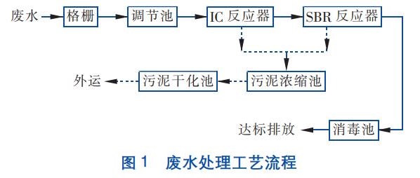 废水由厂区排水管直接引入格栅去除悬浮物,人工定期清理栅渣;格栅出水进入调节池,调节水量均和水质,并在池中设置浮球液位计以监测和控制液位;均和后的出水经泵提升进入IC反应器进行厌氧处理,降解大部分有机物;出水自流到SBR反应器,完成有机物的彻底降解、脱氮除磷;最后消毒后达标排放。