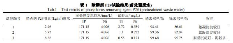 实验结果见表 1 和表 2。关于电镀废水厂前处置废水,假如从磷去除率和除磷药剂费用两方面思索,石灰较好。但除磷剂 P2#可以将磷降到 1 mg/L 以下,而石灰很难。除磷剂 P2#在去除镍方面优势明显。