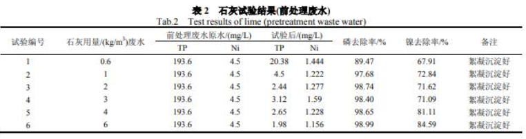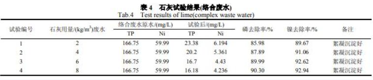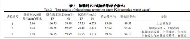 实验结果见表 3 和表 4。关于电镀废水厂络合废水,假如从磷去除率和除磷药剂费用两方面考量,石灰较好。但除磷剂 P2#在除镍方面更好。