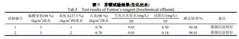 实验结果见表 5。关于电镀废水厂生化出水,采用芬顿氧化化学沉淀法,能够将 TP 降到 0.5 mg/L 以下。