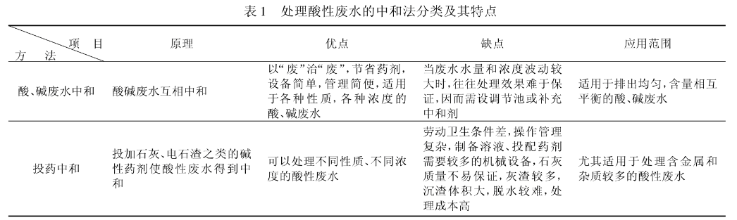 早期,关于含酸1%以下的酸性工业废水处理通常采用化学中和法。详细办法有:酸、碱废水中和、投药中和、过滤中和等。其中过滤中和通常适用于含油和盐较少,含酸浓度不高(硫酸小于2g/L,盐酸、硝酸小于20~30g/L)的酸性废水,该法通常不用于钢铁酸洗废水处置。前两种办法的处置原理和优缺陷等见表1。