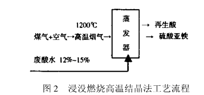 在二十世纪六七十年代,上海、天津、吉林等地采用浸没燃烧高温结晶法将浓度12%~15%废酸提升到45%~57%,同时制备含一个结晶水的硫酸亚铁(FeSO4・H2O)。该法的优点是热效率高,再生酸浓度高,设备较易处理,缺陷是酸雾大,需用可燃气体,较适用于处置量大的废酸。