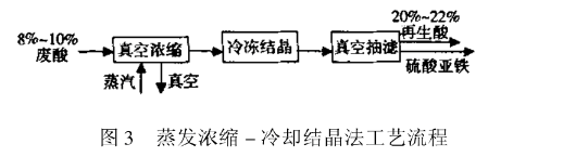 其根本原理是应用负压蒸发浓缩废液,然后在低温下从废液中析出硫酸亚铁结晶并得到再生硫酸。适用于回收大型钢铁厂的酸洗废液中的硫酸亚铁和硫酸。其工艺流程见图3。
