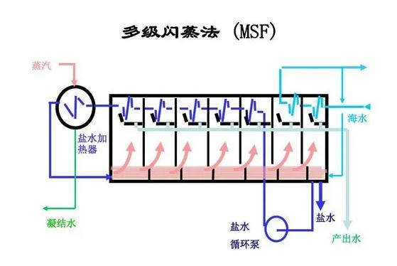 多级闪蒸(MSF)是将热盐水引入闪蒸室后过热而急速的局部气化,从而使热盐水本身的温度降低,所产生的蒸汽冷凝后即为所需的除盐水。