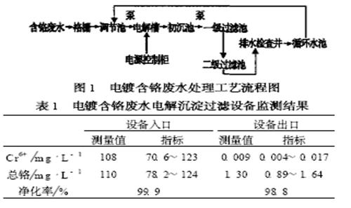 电镀含铬废水采用电解法沉淀过滤工艺处置后全部回用, 过滤池内填料定期集中于锅炉房掺烧, 到达了综合管理电镀含铬废水的目的。
