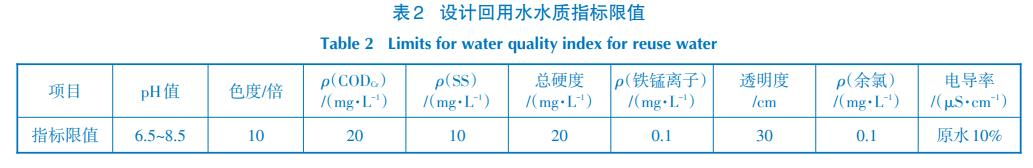 深度处置进水水质请求为pH值为6~10,色度为80倍,CODCr为100mg/L,设计回用水水质指标参考《纺织染整工业废水管理工程技术标准(HJ471—2009)》染色回用水质规范,见表2。