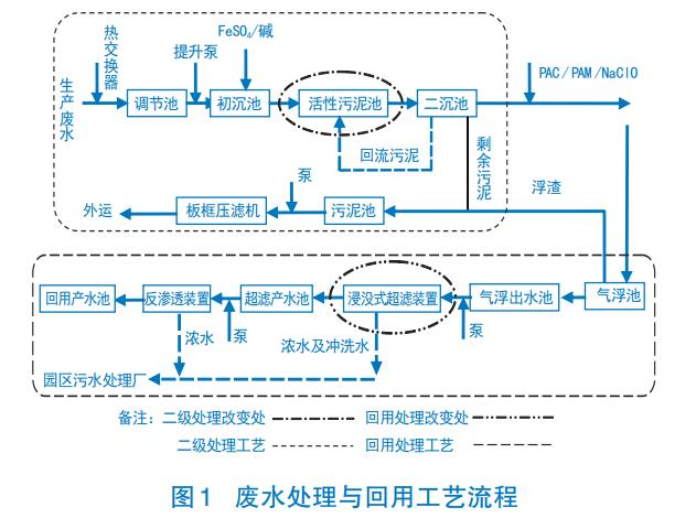 针对一期工程运转时发现的问题,二期工程对工艺作了针对性调整,把“水解酸化池+生物接触氧化池”组合调整为“完整混合式活性污泥池”,“砂滤、炭滤、精滤+管式超滤”组合调整为“浸没式超滤安装”,二级处置与回用途理工艺见图1,圆圈局部为与一期工程不同之处。原一期工艺见论文《纺织印染废水处置中的异味气体控制工程实例》。