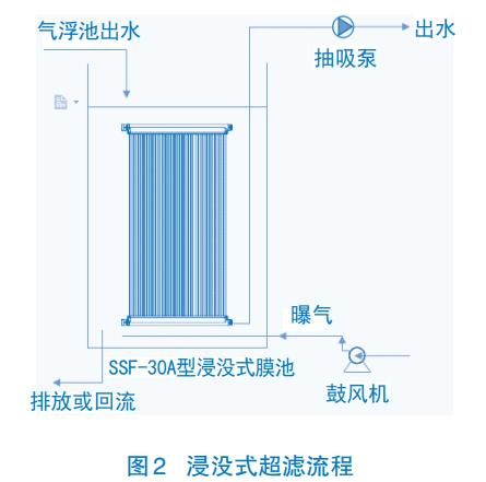 二期超滤由原先的管式超滤改为浸没式超滤,浸没式超滤系统的能耗低于其他超滤系统,更易与传统工艺相分离。浸没式超滤系统的超滤膜可浸入所需处置水中,占空中积省,是膜法水处置的热点。二期超滤采用厢式自清洗超滤安装方式,所用超滤膜为加强型偏氟乙烯(PVDF)中空纤维,系统经过抽吸泵(产水泵)在中空纤维膜内构成负压,待处置水因负压构成动力,净水经过超滤膜微孔进入中空纤维内部通道,聚集至产水管,经过抽吸泵进入出水池,超滤产生的外排水回至调理池。超滤系统流程见图2。