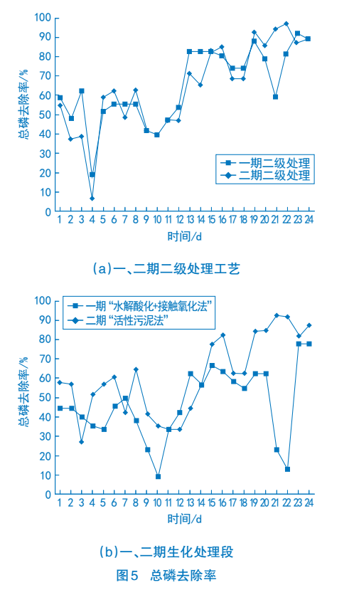 调理池废水总磷质量浓度介于1.5~4.0mg/L,均匀值为2.17mg/L。由图4(a)可知,一、二期二级处置工艺总磷均匀去除率分别为64%和64%,规范偏向σ分别为22.99和18.96;由图4(b)可知,一、二期生化池对废水总磷均匀去除率分别为61%和46%,规范偏向σ分别为20.31和18.81。因而,一、二期二级处置工艺总磷去除率均不高,活性污泥法总磷去除率较低,运转稳定性均较差。主要缘由为水解酸化段氧浓度较低,有利于聚磷菌对磷的释放,接触氧化段氧浓度较高,有利于聚磷菌对磷的过量吸收。