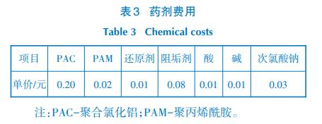 在二期工艺运转后,实践运转管理人员未增加,由现有操作人员兼任,因而,本钱剖析主要包括电费和药剂费用。因二期设备为新设备,需用大量药剂实行清洗,因而,初期本钱核算时,二期本钱较高,若仅思索正常运转所含电费和药剂费,一、二期本钱接近。二期每吨水所用药剂费用见表3。