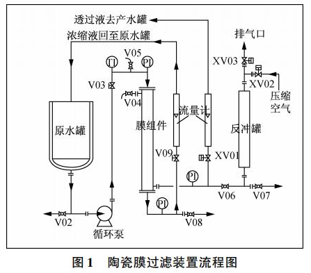 采用的陶瓷膜以α-Al2O3/ZrO2为原资料烧制而成,膜元件参数:19通道,膜管外径30mm,通道直径4mm,膜元件长度1016mm,膜面积0.22m2,陶瓷膜孔径50nm。陶瓷膜过滤设备流程如图1所示。