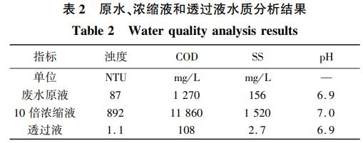 实验分别取废水原液、10倍浓缩液和透过液实施剖析,水质状况如表2和图3所示。