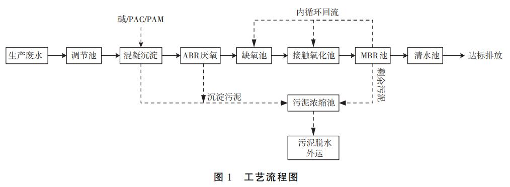 白酒废水经过车间排水管道搜集后汇入车间外初级沉淀池,经格栅和初级沉淀的作用去除酒糟和大颗粒悬浮物后自流至调理池,平衡水质和水量。调理池出水经提升泵提升至混凝沉淀一体化设备中,并向混凝区投加混凝剂(PAC、PAM)和NaOH,应用混凝剂的吸附和凝聚作用去除废水中细微悬浮物和胶体微粒,同时去除废水中的总磷,并将废水pH值调至7.5~8.0,以满足后续生化处置所需条件,特别保证厌氧反响所需碱度。混凝沉淀池出水自流至ABR厌氧池,应用厌氧菌降解有机物以减轻系统后续工艺的处置负荷,同时应用厌氧发酵作用杀灭局部致病菌。ABR厌氧池出水自流进入缺氧池处置,缺氧池中与内循环回流的泥水混合物混合反响,起到反硝化脱氮的作用。随后进入接触氧化池内,好氧微生物应用外界提供的氧气,将污水中的有机污染物进一步合成,一局部用于合成微生物本身构造构成污泥,另一局部则被好氧微生物合成为CO2和H2O,释放到大气中,水中的有机污染物在好氧阶段被大量去除。在MBR池污水经泥水别离后进入清水池可到达外排规范。系统所产生的物化污泥和剩余污泥排入污泥浓缩池,定期经过厢式压滤机降低污泥含水率,污泥浓缩池上清液和厢式压滤机的滤液回流至调理池实施处置。泥饼外运实施卫生填埋处置。详细工艺流程见图1。