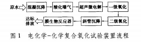 研讨采用的电化学一化学复合氧化集成安装主要由微电解、两级复合氧化、膜生物反响器等单元构成,可完成污水中难降解有机物高效去除等功用,根本流程如图1所示。