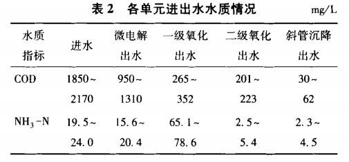 由表2可知,COD沿处置流程逐渐降低,其中超声微电解和一级氧化单元是COD去除的重点工艺段,COD去除率分别可达44%、73%;NH3-N则呈现先升高后降低的趋向,剖析是由于在一级氧化单元局部有机N转化成无机N,后在二级氧化单元氧化去除。