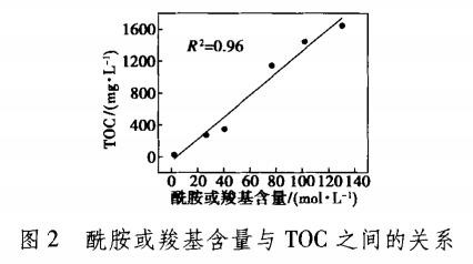 由表3可知,原水经酸化曝气后,酰胺类物质含量显著增加,剖析是由于丙烯腈类等水溶性较低的有机物在硫酸的作用下水解生成丙烯酰胺。随着后续处置工艺,酰胺或羧基的含量逐步降低。经剖析,发现酰胺或羧基的含量与TOC呈现较好的线性关系,R2=0.96,见图2,阐明酰胺或羧基的C=O官能团是构成TOC的重要组分。