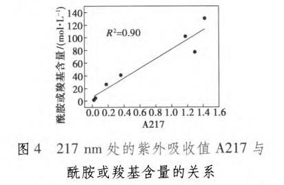 由图3可知,原水在紫外区具有2个主要的吸收峰,217nm和235~280nm,随着处置流程该吸收峰强发作了变化。如图4所示,217nm处的紫外吸收值A217与酰胺或羧基含量之间呈现较好的线性关系,标明217nm处的吸收峰代表了酰胺或羧基的C=O官能团,而235~280nm处的吸收峰则可能代表C≡O。